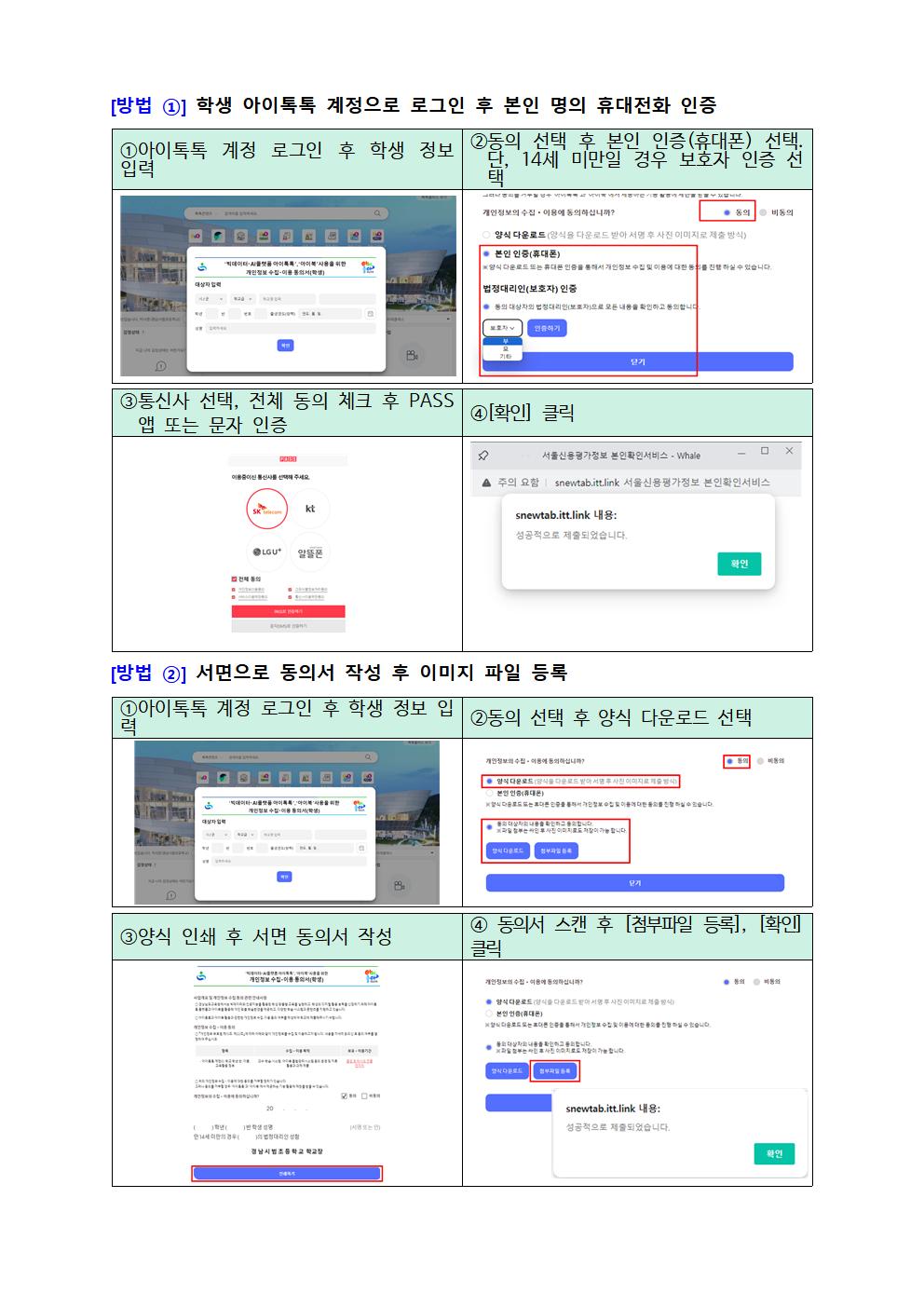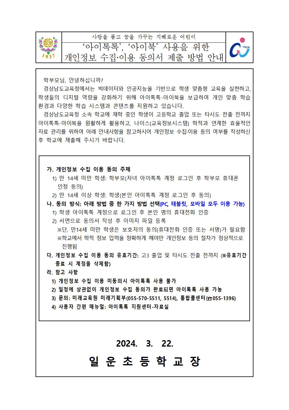 '아이톡톡','아이북' 사용을 위한 개인정보 수집이용 동의서 제출방법 안내