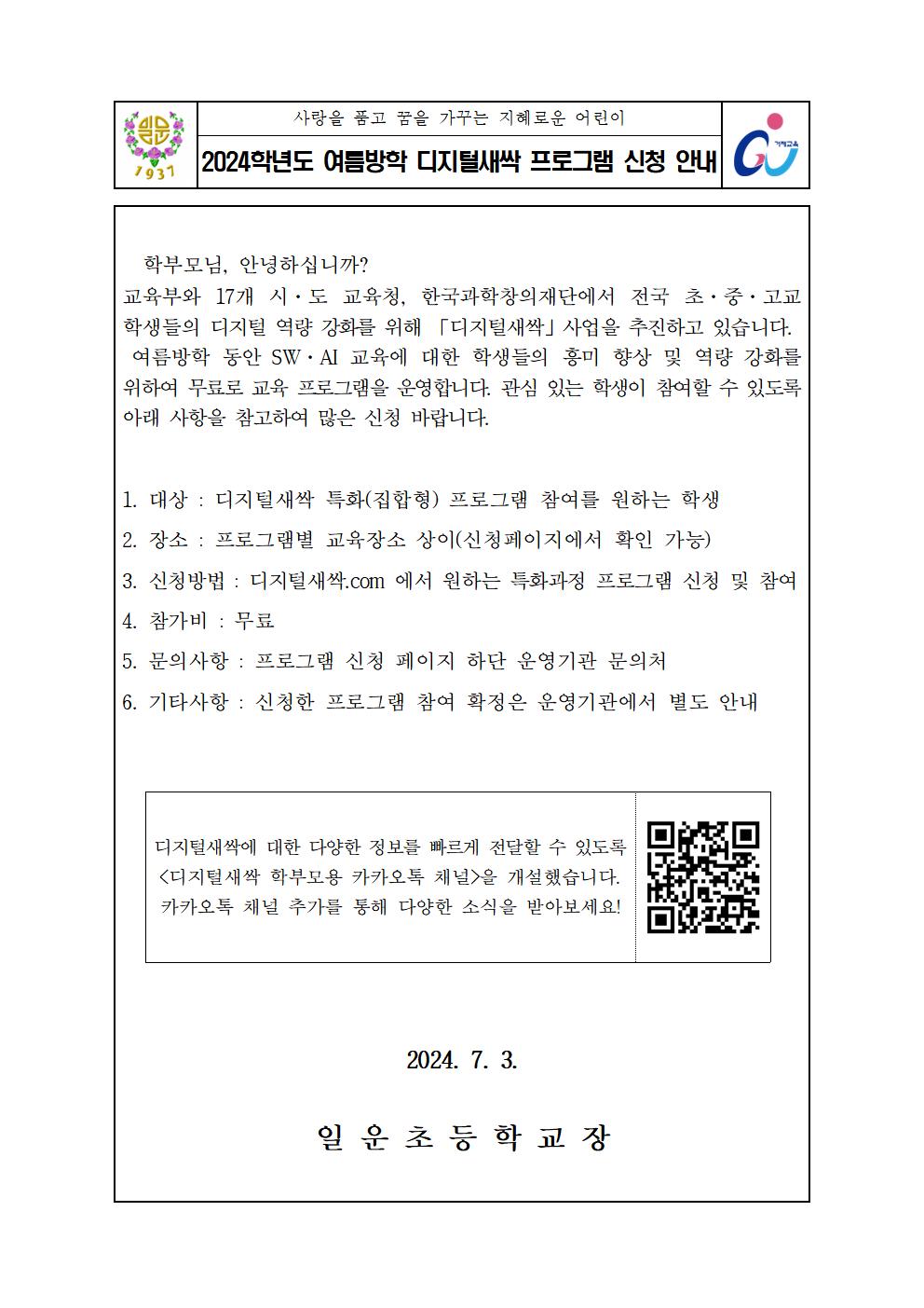 2024학년도 여름방학 디지털새싹 프로그램 신청 안내